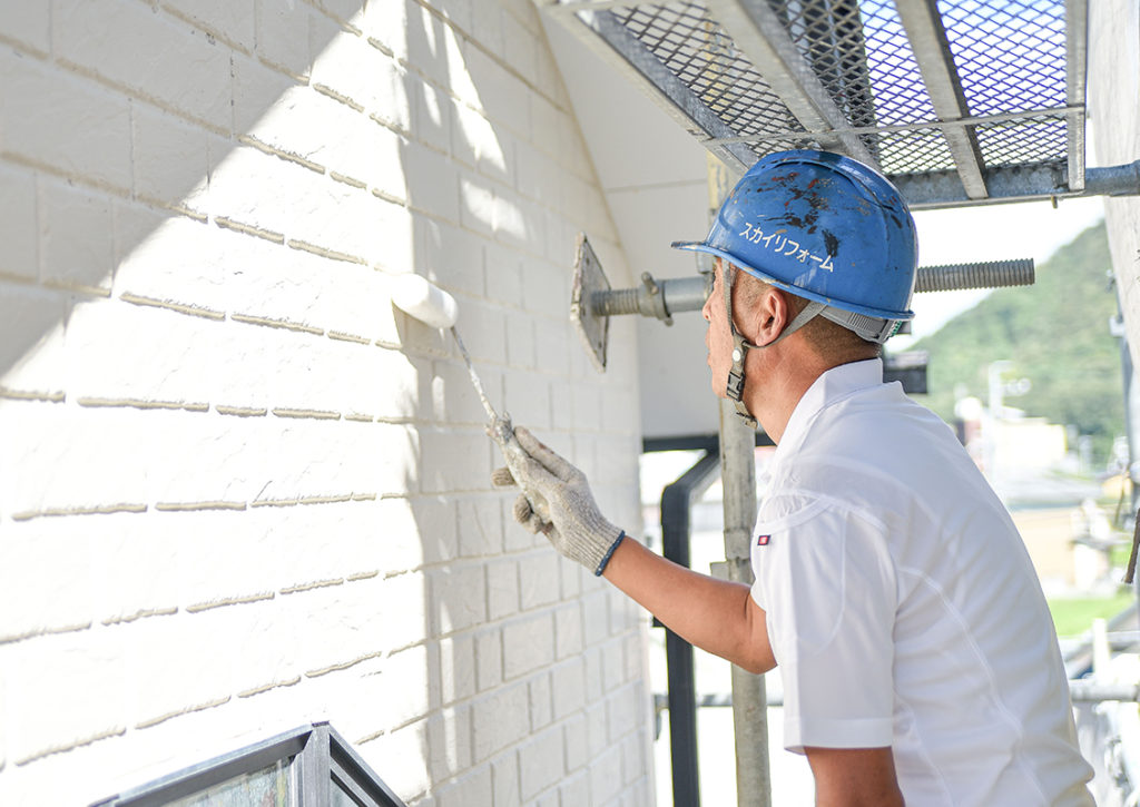 まずは下塗り。これは壁面と塗料をしっかりと付ける役割がある大切な工程です。壁面によって、それぞれに合った「下地強化材」を使用するのがポイントです。